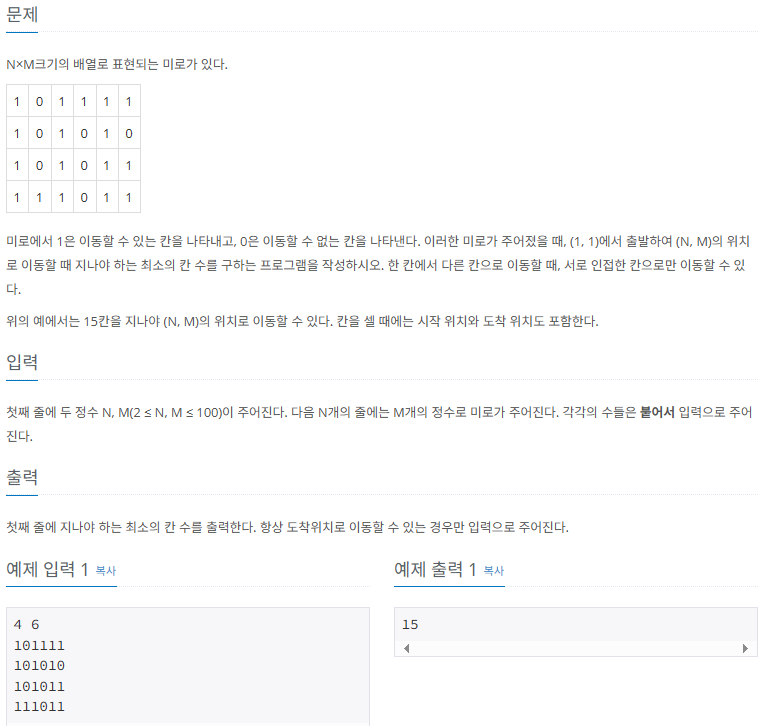 - 그 결과 maze[N][M]은 여전히 1 또는 0으로 남을 수 있음 → 출력 이상하게 됨