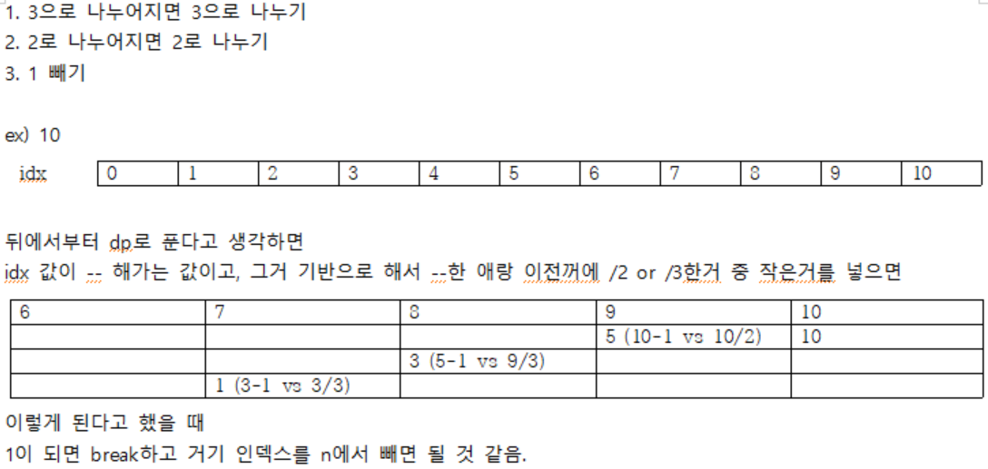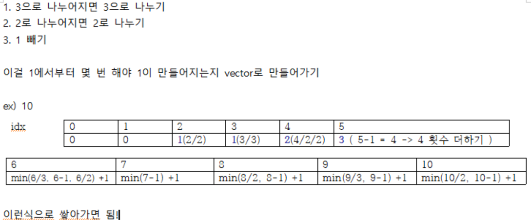 1을 빼는 경우 (i - 1) // 2로 나누는 경우 (i / 2) // 3으로 나누는 경우 (i / 3)