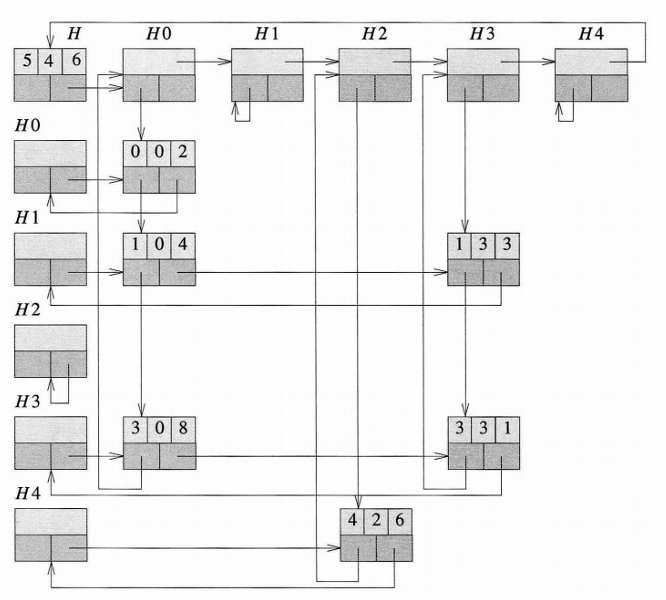 각 행과 열은 원형 연결 리스트로 표현되고, 모든 헤더 노드는 next 포인터로 연결됨.