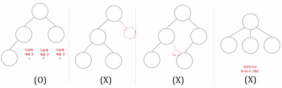 | - 모든 노드의 자식 노드는 최대 2개 - 노드는 위에서부터, 왼쪽부터 꽉 채워진다 |