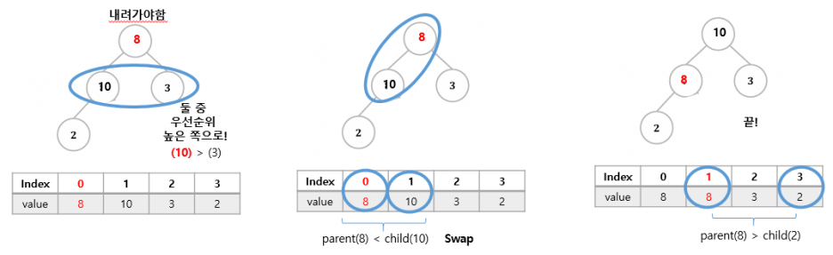 2) 루트 노드에서부터 우선순위 높은 자식노드와 비교하여 우선순위가 낮으면 바꿔내려간다