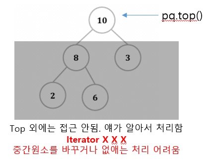 - less<T> : 큰 값이 top (key type에 operator < 정의 필수)