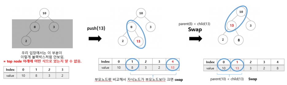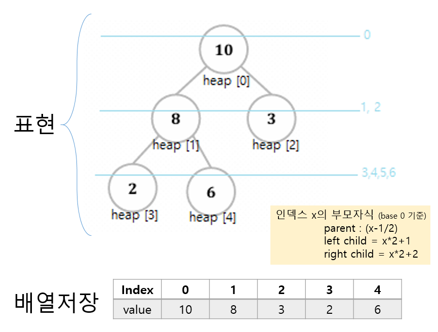 완전 이진트리이기 때문에 각 노드의 부모, 자식의 인덱스를 수식으로 구할 수 있다.