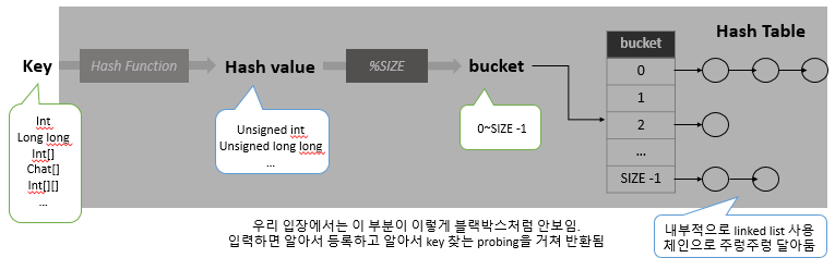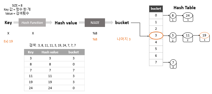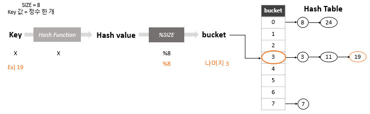 | 3. Bucket | 나눗셈 법 : hash value % size | |