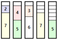 | 1) 7 → 통1 (3남음) 2) 5 → 통2 (5남음) 3) 6 → 통 3 (4남음) 4) 4 → 통2 (1남음) 5) 2 → 통1 (1남음) 6) 3 → 통2 (2남음) 7) 7 → 통4 (3남음) 8) 5 → 통5 (5남음) |